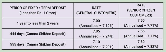 Canara Bank has special fixed deposit schemes for 444 and 555 Days where the rates are as high as 7.05% &7.10%(for general customers) and 7.55% &7.60% (for senior citizens).The annual yield works out to be 7.24% &7.29% for general customers and 7.77% &7.82% for senior citizens.The interest rates being offered now are most competitive amongst the PSB banks with much better and attractive yields.