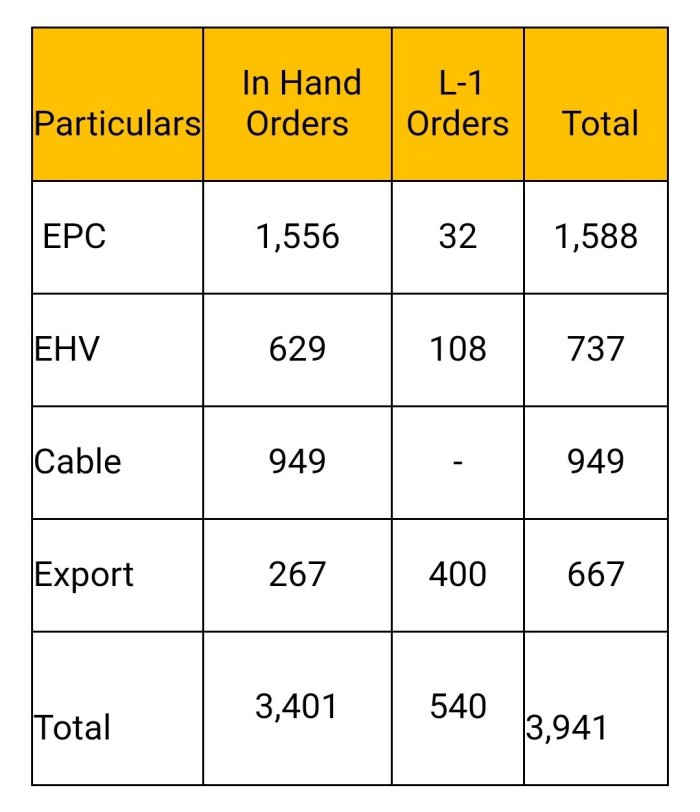 Pending order as on date is approx. Rs 3,401 Crore plus L1 Rs 540 Crore of EPC , EHV & Export as per below details.