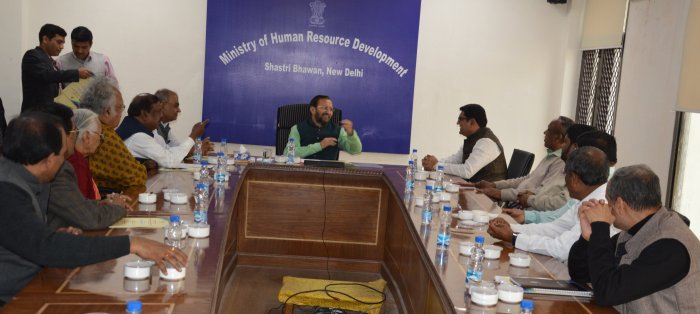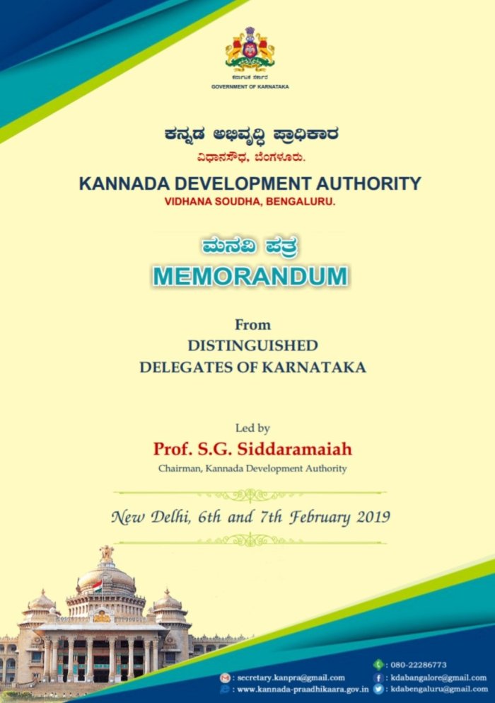 KANNADA DEVELOPMENT AUTHORITY delegation led by KDA, Chairman Prof. S.G. Siddaramaiah and Members met Union Human Recourses and Development Minister Shri. Prakash Javadekar in New Delhi on Wednesday. submitted the Memorandum. Karnataka Government Representative in New Delhi Shri.Sayad Mohamad Altaf, Dr. L. Hanumanthaiah, MP, Rajyasabha, Renowned Kannada Writer and Ex Chairman, KDA, Bengaluru., Smt. B.T. Lalitha Nayak, Ex Minister, Government of Karnataka and Renowned Kannada Writer, Dr. Manu Baligar, President Kannada Sahithya Parishat, Dr. Siddalingaiah, Renowned Kannada Writer, Ex-Member of Legislative Council and Ex Chairman, KDA, Bengaluru, Prof. Kalegowda Nagavara, Renowned Kannada Writer. Dr. H.S. Shivaprakash, Renowned Kannada Writer and Professor, JNU, New Delhi, Dr. Venkatachala G Hegde, President, Delhi Karnataka Sanga, New Delhi, Sri. J. Prabhakara Patel, Member, KDA, Sri C.F. Naik, Member, KDA, Dr. K. Muralidhara, Secretary, KDA, Bengaluru. Resident Commissioner Shri.Nilaya Mithasha were Present.
