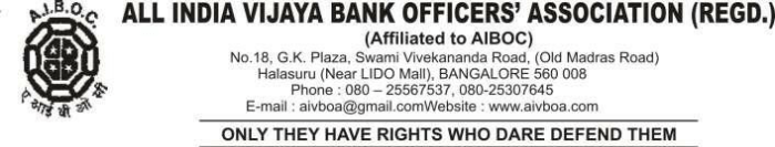 9೦% ಪ್ರತಿಶತಕ್ಕಿಂತ ಹೆಚ್ಚು ಸದಸ್ಯತ್ವ ಹೊಂದಿರುವ ಅತೀ ದೊಡ್ಡ ಅಧಿಕಾರಿ ಸಂಘಟನೆಯಾದ ನಾವು, ಅಖಿಲ ಭಾರತೀಯ ವಿಜಯ ಬ್ಯಾಂಕ್ ಅಧಿಕಾರಿಗಳ ಸಂಘ, ೩ ಲಕ್ಷಕ್ಕೂ ಹೆಚ್ಚು ಸದಸ್ಯರನ್ನು ಹೊಂದಿರುವ ಅಖಿಲ ಭಾರತೀಯ ಬ್ಯಾಂಕ್ ಅಧಿಕಾರಿಗಳ ಒಕ್ಕೂಟದ ಅಂಗ ಸಂಸ್ಥೆಯಾಗಿದೆ.