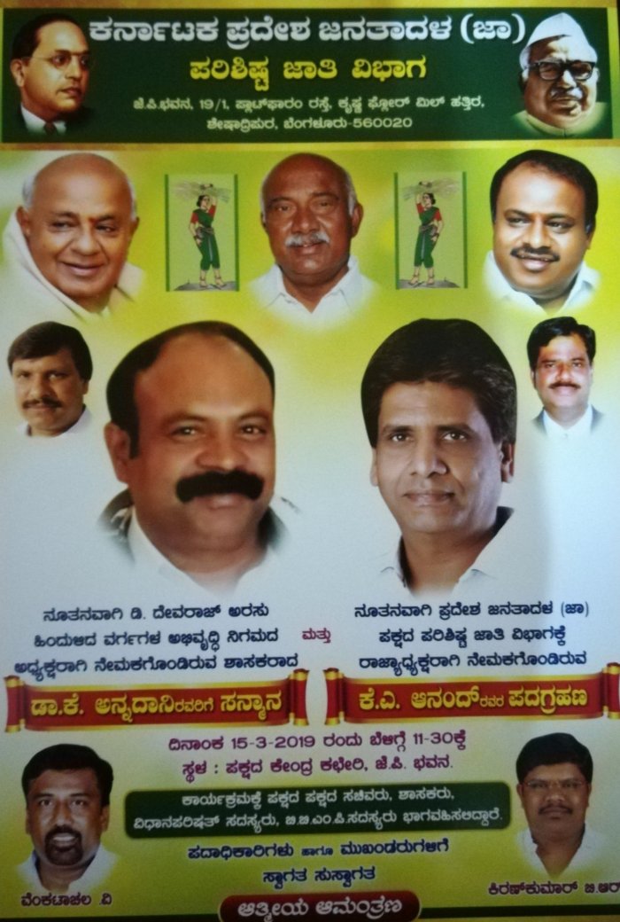 ಅಂದೇ ಶ್ರೀ ಕೆ . ಎ . ಆನಂದ್ರವರು ಕರ್ನಾಟಕ ಪ್ರದೇಶ ಜನತಾದಳ ( ಜಾತ್ಯತೀತ ) ಪಕ್ಷದ ಪರಿಶಿಷ್ಠ ಜಾತಿ ವಿಭಾಗದ “ ನೂತನ ಅಧ್ಯಕ್ಷ ” ರಾಗಿ ಅಧಿಕಾರ ಸ್ವೀಕರಿಸಲಿದ್ದಾರೆ . ಈ ಕಾರ್ಯಕ್ರಮಕ್ಕೆ ಪಕ್ಷದ ರಾಷ್ಟ್ರೀಯ ಅಧ್ಯಕ್ಷರಾದ ಸನ್ಮಾನ್ಯ ಶ್ರೀ ಹೆಚ್ . ಡಿ . ದೇವೇಗೌಡರವರು , ರಾಜ್ಯಾಧ್ಯಕ್ಷರಾದ ಶ್ರೀ ಅಡಗೂರು ಎಚ್ . ವಿಶ್ವನಾಥ್ರವರು , ಪಕ್ಷದ ಸಚಿವರು , ಶಾಸಕರು , ಹಿರಿಯ ಮುಖಂಡರುಗಳು ಭಾಗವಹಿಸಲಿದ್ದಾರೆ .