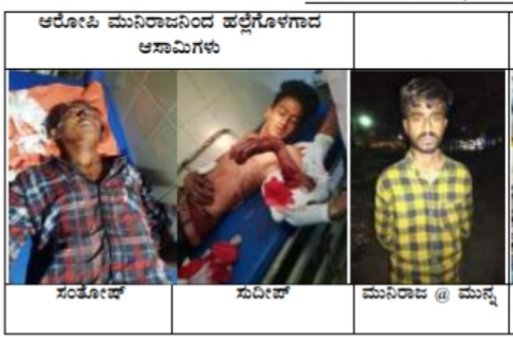 ಉತ್ತರ ವಿಭಾಗ ಬಂಧಿಸಲು ಹೋದ ಪೊಲೀಸರ ಮೇಲೆ ಹಲ್ಲೆ ಮಾಡಲು ಯತ್ನಿಸಿದ ಆರೋಪಿಯ ಮೇಲೆ ಆತ್ಮರಕ್ಷಣೆಗಾಗಿ ಪೋಲೀಸರಿಂದ ಗುಂಡಿನ ದಾಳಿ ಆರೋಪಿ ಮುನಿರಾಜನಿಂದ ಹಲ್ಲೆಗೊಳಗಾದ ಗಾಯಗೊಂಡ ಆಸಾಮಿಗಳು ಪೊಲೀಸರು ಸಂತೋಷ್ ಸುದೀಪ್ ಮುನಿರಾಜ ( @ ಮುನ್ನ | ಬಸವರಾಜ್ ಬಿ . ಎನ್ . ಲೋಹಿತ್ ಪೊಲೀಸ್ ಇನ್ಸ್ಪೆಕ್ಟರ್ ಪಿರಾದುದಾರರಾದ ಸಂತೋಷ ಮತ್ತು ಆತನ ಸ್ನೇಹಿತರು