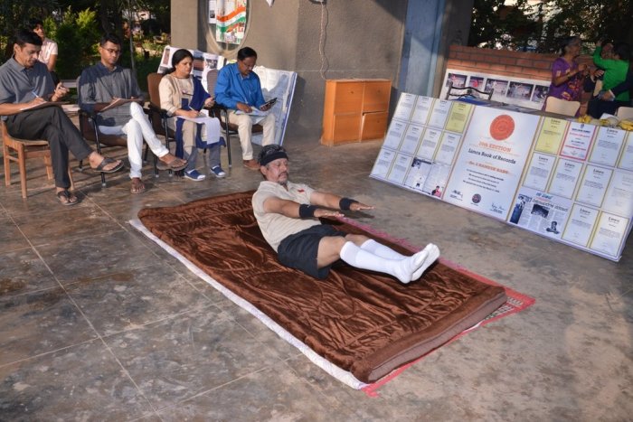 he succeeded in making the committed 300 Naukasanas in just 28 Min. 30 Sec, surpassing his best performance of 300 Naukasanas in 32 Min. during the practice sessions. Not only that, but he went beyond 300 which he had never ever ventured earlier, performing almost at the same pace, pushing my stamina and endurance to humam limits and achieved a aggering 652 Naukasanas 1 exactly 1 Hr., averaging a fast pace of 10.9 Naukasanas per minute. Remarkably, in the last minute, having completed 634 Naukasanas in 59 Minutes, determined to cross 650 in 1 Hr., He achieved an unbelievable pace of 18 Naukasanas in the last minute and reached 652 the Timing official announced STOP at the end of 1 Hr. This achievement was possible mainly because of a perfect harmony between his strong mind and strong body, systematic planning of his practice ns with pre-determined time bound targets, high level of concentration and more importantly excellent control over my breathing and pacing. At the r. punishing feat, he was neither completely exhausted nor gasping for breath. He performed Shavasana to quickly bring back the heart end of the 1 pacing to normalcy. The record was set on 14 April as a gift to my wife Usha on her 62nd birthday The record was officially set following the standard norms set by the Books of Records for such feats, in the presence of general public. Digital display stop watches and mechanical counters were used for accurate counting. The entire record feat was professionally video photographed. The Authenticating Officials were Smt. MALA MANOHAR, Yoga Practioner and Yoga Teacher, School Vivekananda, Bangalore, Yoga Shiromani Mr. SHYAM KURUPPATH, Internationally certified Yoga practitioner and free lance Yoga Teacher, Director of Grorich Horivert Pvt. Ltd Bangalore, Mr. AJITH KUMAR MAIYA, Yoga Practioner and Sr. Technician, Health Centre, IISc., Bangalore and Mr. B. ASHOK KUMAR, Yoga Practioner and Graphic & Printing Consultant, Bangalore. Having successfully accomplished the record, the complete set of authentication documents together with video proof will be sent to the various Books of Records, for official recognition, very soon.