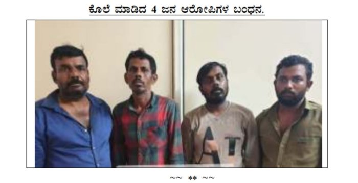 ಈ ಪ್ರಕರಣದ ಆರೋಪಿಗಳಾದ 1 ) ರವೀಶ್ ( @ ರವಿ , 44 ವರ್ಷ , ಹೆಗ್ಗನಹಳ್ಳಿ , ಬೆಂಗಳೂರು ನಗರ , ಸ್ವಂತ ವಿಳಾಸ ಜಾವಗಲ್ , ಅರಸೀಕೆರೆ ತಾಲ್ಲೂಕ , ಹಾಸನ ಜಿಲ್ಲೆ , 2 ) ಜಿತೇಂದ್ರ @ ಜಿತು , 30 ವರ್ಷ , ಹೆಗ್ಗನಹಳ್ಳಿ , ಬೆಂಗಳೂರು ನಗರ , ಸ್ವಂತ ವಿಳಾಸ ಹೊಳೆನರಸೀಪುರ , ಹಾಸನ ಜಿಲ್ಲೆ . 3 ) ಸುಮಂತರಾಜ್ ( @ ಸುಮಂತ್ , 29 ವರ್ಷ , ಅಂದ್ರಹಳ್ಳಿ , ಬೆಂಗಳೂರು ನಗರ ಸ್ವಂತ ವಿಳಾಸ ಸಖರಾಯಪಟ್ಟಣ , ಕಡೂರು ತಾಲ್ಲೂಕ , ಚಿಕ್ಕಮಗಳೂರು ಜಿಲ್ಲೆ . 4 ) ಪ್ರದೀಪ್ ಕುಮಾರ್ ( @ ಪ್ರದೀಪ್ , 40 ವರ್ಷ , ಆಂದ್ರಪಳ್ಳಿ , ಬೆಂಗಳೂರು ನಗರ , ಸ್ವಂತ ವಿಳಾಸ ಹಿರಿಯೂರು ತಾಲ್ಲೂಕ ಚಿತ್ರದುರ್ಗ ಜಿಲ್ಲೆ , ಎಂಬುವರುಗಳನ್ನು ದಸ್ತಗಿರಿ ಮಾಡುವಲ್ಲಿ ರಾಜಗೋಪಾಲನಗರ ಪೊಲೀಸರು ಯಶಸ್ವಿಯಾಗಿರುತ್ತಾರೆ . ಈ ಪ್ರಕರಣದಲ್ಲಿ ಪ್ರಮುಖ ಆರೋಪಿ ಕಿಶೋರ್ ಎಂಬುವವನು ಮೃತ ಹೊಂದಿರುವ ಉಮೇಶ್ನ ಪತ್ನಿ ರೂಪಳೊಂದಿಗೆ 7 – 8 ತಿಂಗಳಿಂದ ಸ್ನೇಹ ಬೆಳಸಿಕೊಂಡು ಆಕೆಯೊಂದಿಗೆ ಅಕ್ರಮ ಸಂಬಂಧ ಇಟ್ಟುಕೊಂಡಿದ್ದು , ಸ್ವಲ್ಪ ದಿನಗಳ ನಂತರ ಕಿಶೋರ್ ಮತ್ತು ರೂಪ ನಡುವೆ ಗಲಾಟೆಯಾಗಿರುತ್ತದೆ . ಈ ಹಿಂದೆ ಕಿಶೋರ್ ರೂಪಳೊಂದಿಗೆ ಲೈಂಗಿಕ ಕ್ರಿಯೆ ನಡೆಸಿದ್ದ ವಿಡಿಯೋ ಚಿತ್ರೀಕರಣವನ್ನು ಆಕೆಗೆ ಗೊತ್ತಿಲ್ಲದಂತೆ ಚಿತ್ರಿಕರಿಸಿ ಇಟ್ಟುಕೊಂಡಿದ್ದು , ತನ್ನ ಪೇಸ್ ಬುಕ್ ಖಾತೆಯಲ್ಲಿ ಹಾಕಿರುತ್ತಾನೆ . ಈ ಸಂಬಂಧವಾಗಿ ರೂಪ ಮತ್ತು ಆಕೆಯ ಗಂಡ ಉಮೇಶ್ ರಾಜಗೋಪಾಲನಗರ ಪೊಲೀಸ್ ಠಾಣೆಯಲ್ಲಿ ಪ್ರಕರಣ ದಾಖಲಿಸಿದ್ದು , ಈ ಪ್ರಕರಣದಲ್ಲಿ ಪೊಲೀಸರು ಆರೋಪಿ ಕಿಶೋರ್ನನ್ನು ದಸ್ತಗಿರಿ ಮಾಡಿ ಜೈಲಿಗೆ ಕಳುಹಿಸಿರುತ್ತಾರೆ . ಜಾಮೀನಿನ ಮೇಲೆ ಹೊರಗೆ ಬಂದ ಕಿಶೋರ್ , ರೂಪ ಮತ್ತು ಆಕೆಯ ಗಂಡನ ಮೇಲೆ ಸೇಡು ತೀರಿಸಿಕೊಳ್ಳಬೇಕೆಂದು ತನ್ನ 3 – 4 ಜನ ಸ್ನೇಹಿತರೊಂದಿಗೆ ಈ ಕೃತ್ಯ ಎಸಗಿರುವುದಾಗಿ ತಿಳಿದು ಬಂದಿರುತ್ತದೆ . ಈ ಪ್ರಕರಣದಲ್ಲಿ ಆರೋಪಿಯಾದ ಕಿಶೋರ್ ಎಂಬುವನು ತಲೆ ಮರೆಸಿಕೊಂಡಿದ್ದು , ಆತನ ಪತ್ತೆ ಕಾರ್ಯ ಪ್ರಗತಿಯಲ್ಲಿದೆ . ಈ ಪ್ರಕರಣದಲ್ಲಿ ಶ್ರೀ ಎ . ಧನಂಜಯ , ಎಸಿಪಿ , ಮಲ್ಲೇಶ್ವರಂ ಉಪ ವಿಭಾಗ ರವರ ಮಾರ್ಗದರ್ಶನದಲ್ಲಿ ಶ್ರೀ ದಿನೇಶ್ ಪಾಟೀಲ್ , ಪೊಲೀಸ್ ಇನ್ಸ್ಪೆಕ್ಟರ್ , ರಾಜಗೋಪಾಲನಗರ ಪೊಲೀಸ್ ಠಾಣೆ , ಶ್ರೀ ಸಿ . ರವಿಕುಮಾರ್ , ಪಿಎಸ್ಐ ಮತ್ತು ಸಿಬ್ಬಂದಿಯವರುಗಳಾದ ಹೆಚ್ಸಿ 6648 , ಶಿವಕುಮಾರ್ , ಹೆಚ್ಸಿ 8155 ಶ್ರೀ ಪರಮೇಶ್ , ಹೆಚ್ಸಿ 5134 ಶ್ರೀ ಸಿದ್ದಪ್ಪ , , ಪಿಸಿ 7162 ಜೈಶಂಕರ್ , ಪಿಸಿ 15587 ಶ್ರೀ ಶಿವಸ್ವಾಮಿ , ಪಿಸಿ – 10561 ಶ್ರೀ ಪ್ರಕಾಶ್ ನಾಯ್ಕ ಎಂಬುವರುಗಳು ಆರೋಪಿಗಳನ್ನು ಬಂಧಿಸುವಲ್ಲಿ ಯಶಸ್ವಿಯಾಗಿರುತ್ತಾರೆ .