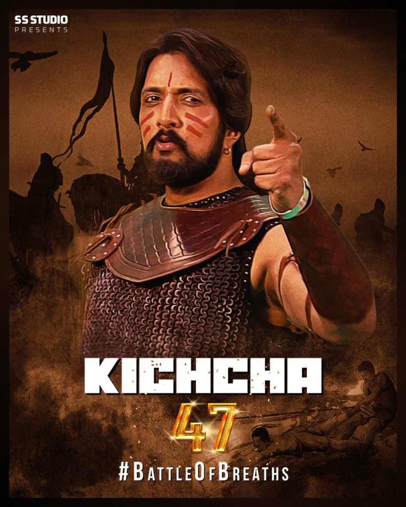 Introducing the new poster of Kannada Superstar Badshah Kiccha Sudeep: A visual masterpiece but what does it signify?. That’s the big mystery everyone’s buzzing about. Brace yourself for the big reveal next week, as we lift the veil on Kiccha’s poster secrets. Something huge is coming your way, and you won’t want to miss it! Stay tuned for a larger-than-life reveal. #BattleofBreaths