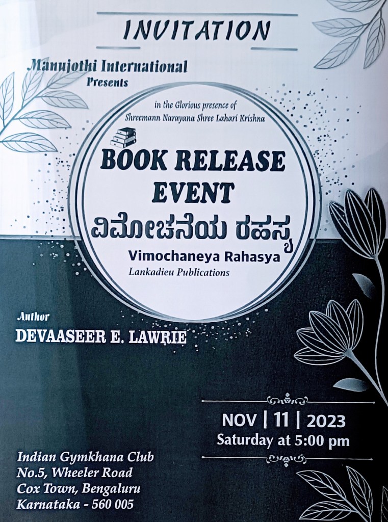 ಮನು ಜ್ಯೋತಿ ಆಶ್ರಮವತಿಯಿಂದ “ವಿಮೋಚನೆಯ ರಹಸ್ಯ” ಎಂಬ ಪುಸ್ತಕ ಬಿಡುಗಡೆ ಸಮಾರಂಭ ಇದೇ 11ರಂದು ಬೆಂಗಳೂರಿನಲ್ಲಿ ನಡೆಯಲಿದೆ ಎಂದು ಆಶ್ರಮದ ಸಂಚಾಲಕ ಗಣೇಶ್ ತಿಳಿಸಿದರು.