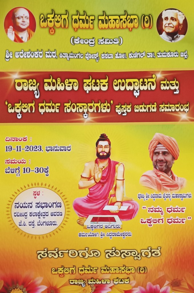 ದಿನಾಂಕ 19-11-2023, ಭಾನುವಾರ ನಡೆಯುವ ಒಕ್ಕಲಿಗ ಧರ್ಮ ಮಹಾಸಭಾ ಮಹಿಳಾ ಘಟಕ ಉದ್ಘಾಟನೆ ಮತ್ತು ಒಕ್ಕಲಿಗ ಧರ್ಮ ಸಂಸ್ಕಾರಗಳು ಪುಸ್ತಕ ಬಿಡುಗಡೆ ಕಾರ್ಯಕ್ರಮಕ್ಕೆ ಆಹ್ವಾನ