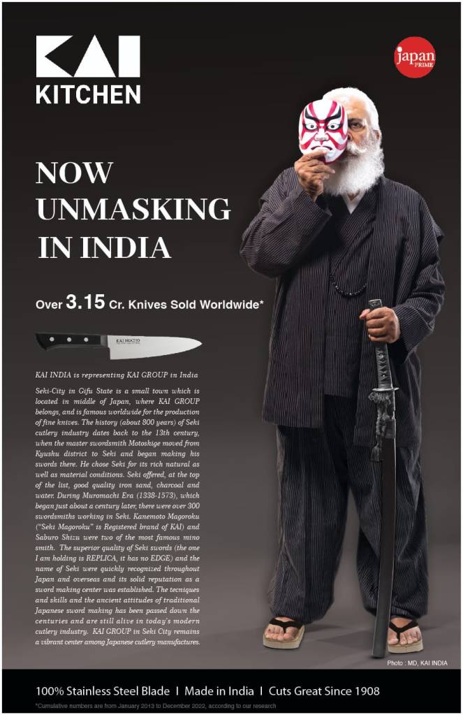 Bengaluru November –Kai India, the Indian subsidiary of Japan’s renowned brand KAI, known for its 115-year legacy in crafting premium kitchenware, is excited to announce their new knife print ad campaign featuring Managing Director, Mr. Rajesh U Pandya, with Kabuki mask. This exceptional campaign promises to embrace the essence of Kabuki, a classical form of Japanese theater, creating a visually captivating and culturally rich experience.