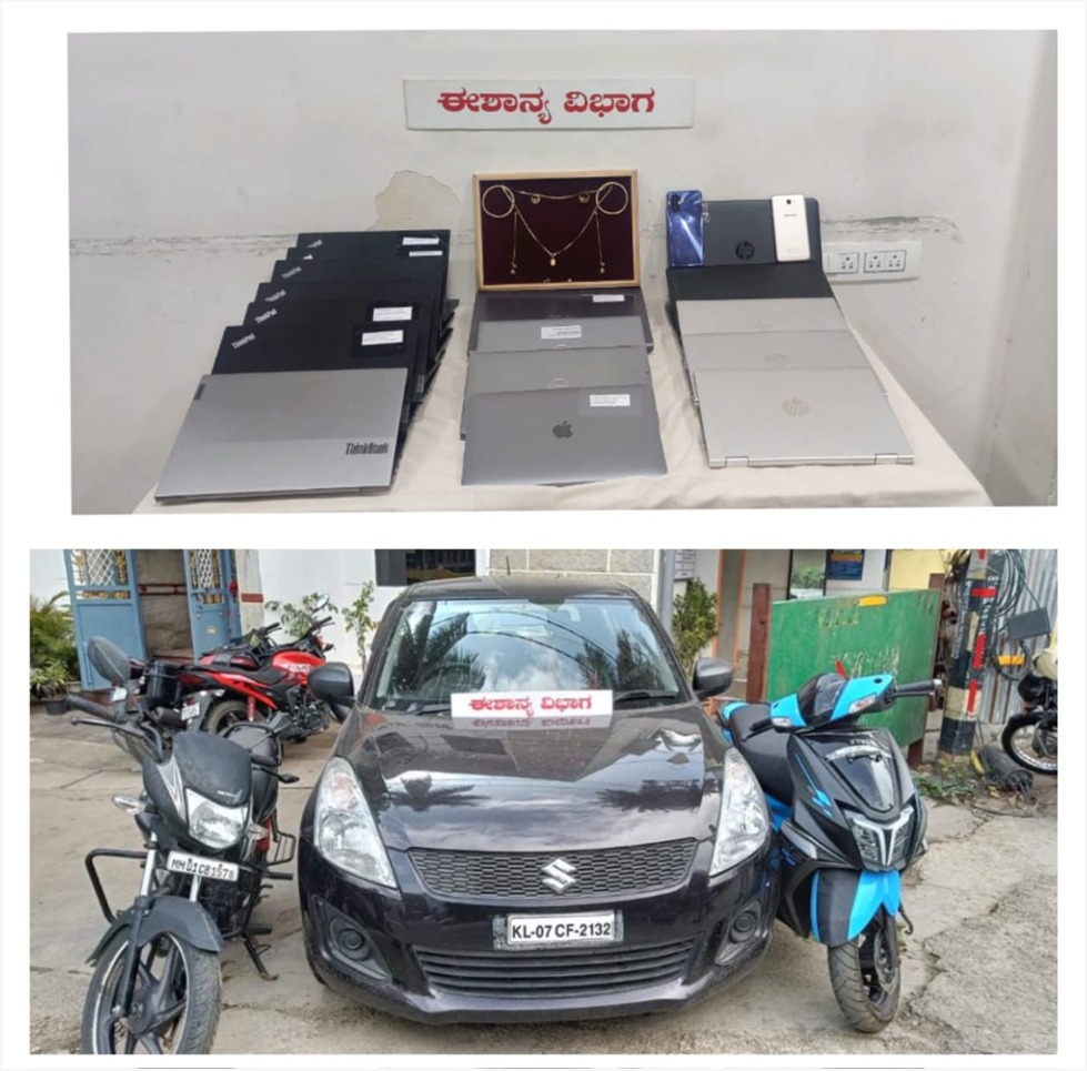 ಆರೋಪಿತರ ಬಂಧನದಿಂದ ಸುಮಾರು * 18,00.000/- ಬೆಲೆಬಾಳುವ 15 ವಿವಿಧ ಕಂಪನಿಯ ಲ್ಯಾಪ್ಟಾಪ್ಗಳು, ಎರಡು ಮೊಬೈಲ್, ಒಂದು ಮಾರುತಿ ಸ್ವೀಪ್ಟ್ ಕಾರು, ಒಂದು ಥೀಮ್ ಯುಗಾ ಬೈಕ್ ಹಾಗೂ 60 ಗ್ರಾಂ ತೂಕದ ಚಿನ್ನದ ಆಭರಣಗಳನ್ನು ವಶಪಡಿಸಿಕೊಂಡಿರುತ್ತಾರೆ.