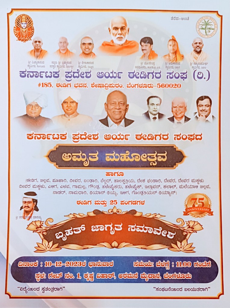 ಕರ್ನಾಟಕ ಪ್ರದೇಶ ಆರ್ಯ ಈಡಿಗರ ಸಂಘದ ಅಮೃತ ಮಹೋತ್ಸವ ಹಾಗೂ ಈಡಿಗ ಹಾಗೂ 25 ಪಂಗಡಗಳ ಬೃಹತ್ ಸಮಾವೇಶ ಬೆಂಗಳೂರಿನ ಅರಮನೆ ಮೈದಾನದಲ್ಲಿ ಡಿಸೆಂಬರ್ 10 ಭಾನುವಾರ ನಡೆಯಲಿದೆ.