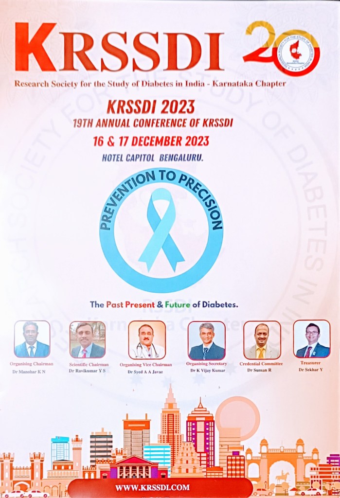 Under the chairmanship of Dr. Manohar KN, KRSSDI is organising the Karnataka State annual Diabetes conference for 2023 at Hotel Capitol Bangalore on 16th and 17thDecember. This year coincides with the 20th Year Anniversary of KRSSDIestablishment and marks an important milestone.