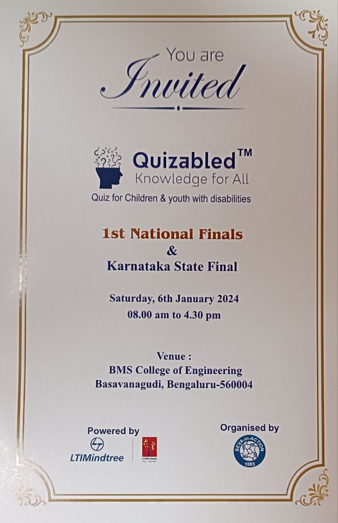 In this year’s Quizabled (9th edition) for the first time a National finale is being introduced. Studentswith Hearing impairment and Visual impairment from 10 states will be part of the finale ThisNational finale will be a culmination of diversity in languages and geographical backgrounds.Shri. A. Narayanaswamy, Minister, Ministry of Social Justice & Empowerment, Govt of is thechief guest for the event and Mr Pratyush Head-ESG LTIMindtree is the guest of Honour for theevent on 6th January 2024 at BMS College of Engineering, Basavanagudi