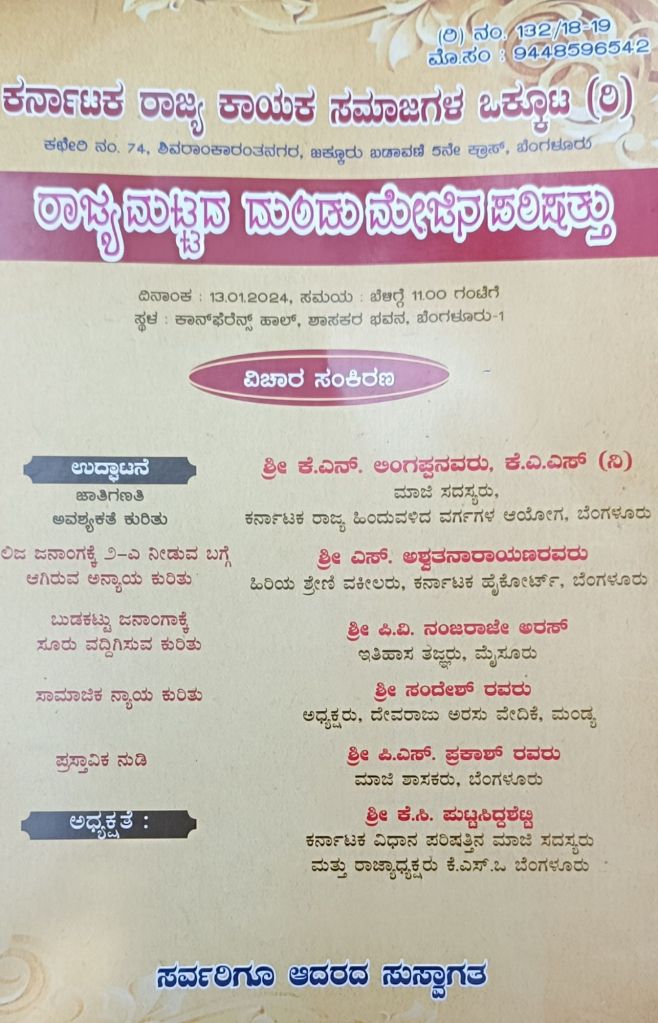 ಸಂವಿಧಾನ ಕಲ್ಪಿಸಿರುವ ಅನುಚ್ಚೇದ 15 ಕಲಂ 4 ಮತ್ತು 17 ಕಲಂ 4ನ್ನು ಸರ್ಕಾರ ಉಲ್ಲಂಘಿಸುತ್ತಿದೆ. ಅದಕ್ಕಾಗಿ ನಾವು ದಿನಾಂಕ: 13ನೇ ಜನವರಿ 2024ರಂದು ಶನಿವಾರ 1130 ಗಂಟೆಗೆ ಶಾಸಕರ ಭವನ (2) ಸಭಾಂಗಣದಲ್ಲಿ ರಾಜ್ಯ ಮಟ್ಟದ ದಂಡುಮೇಜಿನ ಪರಷಿತ್ತನ್ನು ನಡೆಸುತ್ತಿದ್ದೇವೆ ಎಂದು ಒಕ್ಕೂಟದ ವತಿಯಿಂದ ತಿಳಿಸಲಾಯಿತು.