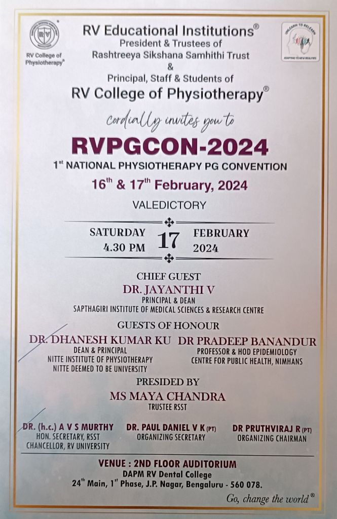 RV ಕಾಲೇಜ್ ಆಫ್ ಫಿಸಿಯೋಥೆರಪಿ ಹೆಮ್ಮೆಯಿಂದ RVPGCON 2024 ರ ಪ್ರಾರಂಭವನ್ನು ಘೋಷಿಸುತ್ತದೆ, ಇದು ಪ್ರತಿಷ್ಠಿತ ರಾಷ್ಟ್ರೀಯ ಮಟ್ಟದ ಸ್ನಾತಕೋತ್ತರ ಸಮಾವೇಶವನ್ನು ಫೆಬ್ರವರಿ 16 ಮತ್ತು 17, 2024 ರಂದು ನಿಗದಿಪಡಿಸಲಾಗಿದೆ. ಈ ಮಹತ್ವದ ಘಟನೆಯು 20 ವರ್ಷಗಳ ಶಿಕ್ಷಣ ಮತ್ತು ಅಭ್ಯಾಸಕ್ಕಾಗಿ RVCP ಯ ಸಮರ್ಪಣೆಯನ್ನು ಸ್ಮರಿಸುತ್ತದೆ.