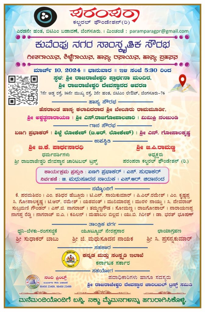 ಕುವೆಂಪು ನಗರ ಸಾಂಸ್ಕೃತಿಕ ಸೌರಭ ಕಾರ್ಯಕ್ರಮ – 10/3/2024 ಭಾನುವಾರ ಸಂಜೆ 5.30ರಿಂದ.