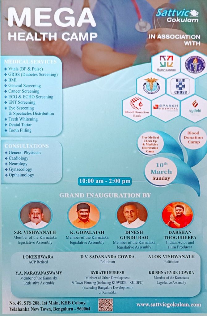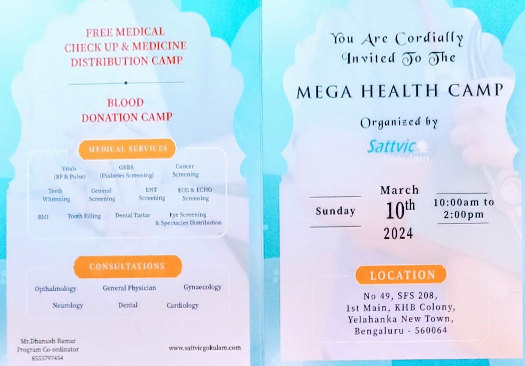 We have organised a Health Camp on 10th March, Sunday which consists of Medical services and Consultation services, medical services include Vitals (BP and Pulse), GRBS (Diabetes Screening), BMI, General screening, Teeth whitening, Tooth filling etc, Consultation Service include General Physician, Cardiology, Neurology, Gynecology and Opthamology