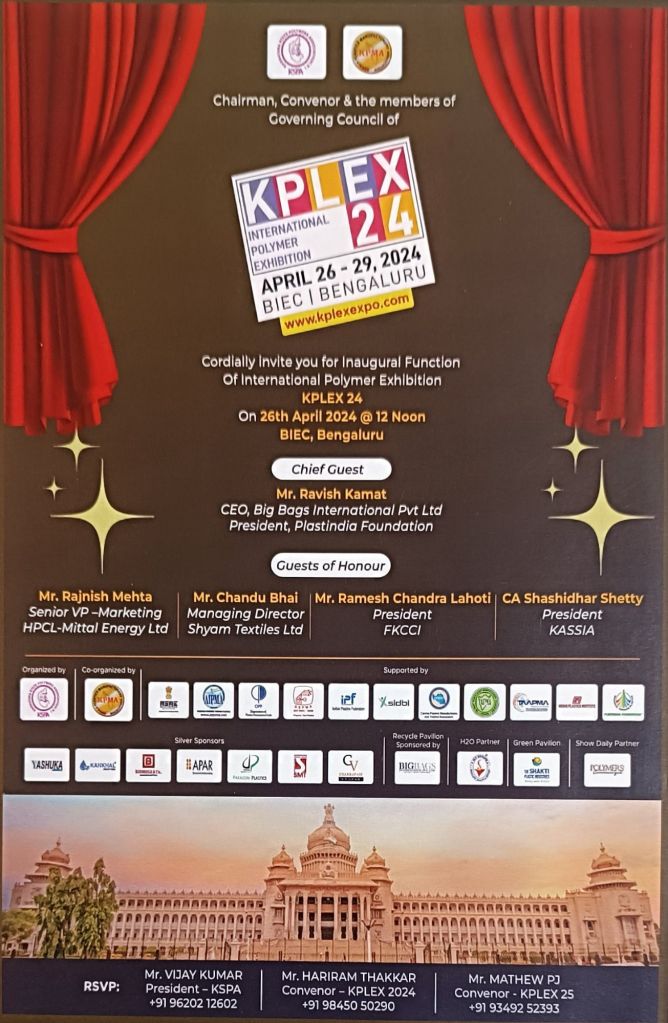 ಬೆಂಗಳೂರು, ಏ.25,2024; ಕರ್ನಾಟಕ ರಾಜ್ಯ ಪಾಲಿಮರ್ಸ್ ಅಸೋಸಿಯೇಷನ್ ನಿಂದ ತುಮಕೂರು ರಸ್ತೆಯ ಅಂತರರಾಷ್ಟ್ರೀಯ ವಸ್ತುಪ್ರದರ್ಶನ ಕೇಂದ್ರದಲ್ಲಿ ಏಪ್ರಿಲ್ 28 ರಿಂದ 29 ರವರೆಗೆ ಅಂತರಾಷ್ಟ್ರೀಯ ಪಾಲಿಮರ್ಸ್ ಪ್ರದರ್ಶನ – ಕಪ್ಲೆಕ್ಸ್ ಆಯೋಜಿಸಲಾಗಿದೆ. ಪ್ಲಾಸ್ಟಿಕ್ ಮರು ಬಳಕೆ, ಅತ್ಯಾಧುನಿಕ ತಂತ್ರಜ್ಞಾನ ಪ್ರದರ್ಶನಕ್ಕ ಇದು ವೇದಿಕೆಯಾಗಿದೆ.