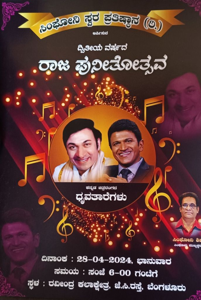 ಡಾ|| ರಾಜ್ ಮತ್ತು ಪುನೀತ್ ರವರ ಸವಿನೆನಪಿನಲ್ಲಿ ಸಿಂಪೋನಿ ಸ್ವರ ಪ್ರತಿಷ್ಠಾನ ರವೀಂದ್ರ ಕಲಾಕ್ಷೇತ್ರದಲ್ಲಿ ಇದೇ ಏಪ್ರಿಲ್ 28ರಂದು ಸಂಜೆ 6 ಗಂಟೆಗೆ ರಾಜ ಪುನೀತೋತ್ಸವ ಕಾರ್ಯಕ್ರಮ ಆಯೋಜಿಸಲಾಗಿದೆ.