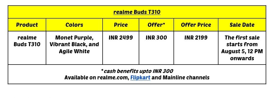 *For specification sheet & product images of realme Buds T310, please refer here: Link