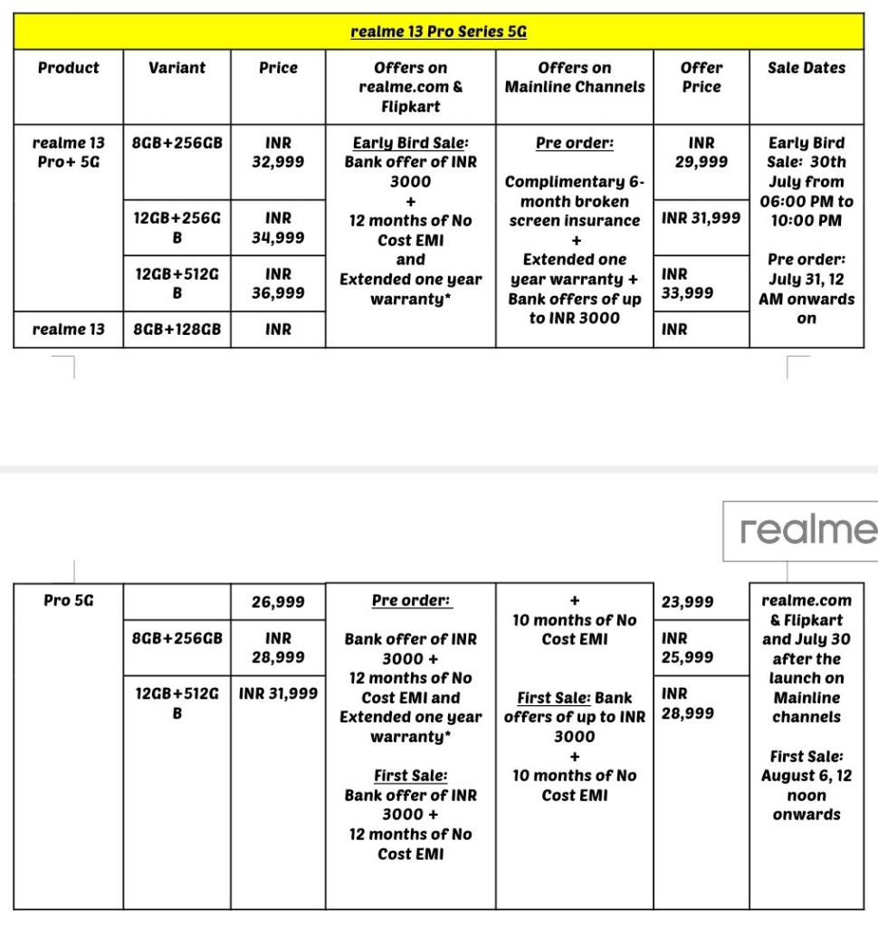 The early bird sale for realme 13 Pro Series 5G is scheduled for 30th July from 06:00 PM to 10:00 PM on realme.com and Flipkart and the pre-booking starts from July 31, 12 AM onwards on realme.com & Flipkart and July 30 after the launch on Mainline channels.