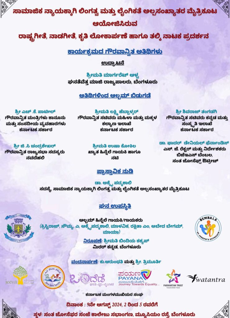 ದೇಶಭಕ್ತಿ ರಾಜ್ಯಾಭಿಮಾನಗಳು ಗಂಡು ಹೆಣ್ಣುಗಳ ಸೊತ್ತಷ್ಟೇ ಅಲ್ಲದೆ ನಮ್ಮಲ್ಲಿಯೂ ರಾಷ್ಟ್ರಪ್ರೇಮ,ರಾಜ್ಯ ಭಕ್ತಿ ಅಣುವಣುವಿನಲ್ಲಿ ತುಂಬಿದೆ ಎಂದು ಸಾರಿ ಸಾರಿ ಹೇಳಲು 9ನೇ,ಆಗಸ್ಟ್ 2024 ರಂದು ದೇಶದ ಇತಿಹಾಸದಲ್ಲಿಯೇ ಪ್ರಪ್ರಥಮ ಬಾರಿಗೆ ಲಿಂಗತ್ವ ಮತ್ತು ಲೈಂಗಿಕತೆ ಅಲ್ಪಸಂಖ್ಯಾತ ಸಮುದಾಯದವರು ರಾಷ್ಟ್ರಗೀತೆ ಮತ್ತು ನಾಡಗೀತೆಯನ್ನು ತಮ್ಮ ನೈಜ ಧ್ವನಿಯಲ್ಲಿ ಹಾಡಿ ದೇಶವು ನಮ್ಮದು ರಾಜ್ಯವು ನಮ್ಮದು ಇಂದು ತಮ್ಮ ದೇಶಪ್ರೇಮ ರಾಜ್ಯಾಭಿಮಾನಗಳನ್ನು ಅಭಿವ್ಯಕ್ತಿಗೊಳಿಸಿರುವ “ಆಲ್ಬಮ್ ವಿಡಿಯೋ ” ಉದ್ಘಾಟನೆ ಗೌರವಾನ್ವಿತ ಶ್ರೀಯುತ.ಶ್ರೀಮತಿ ಮಾರ್ಗರೆಟ್ ಆಳ್ವ ಘನತೆವೆತ್ತ ಮಾಜಿ ರಾಜ್ಯಪಾಲರು, ಬೆಂಗಳೂರು ಮತ್ತು ಅನೇಕ ಸಾಂವಿಧಾನಿಕ ಸಂಸ್ಥೆಗಳ ರೂವಾರಿಗಳ ಘನ ಉಪಸ್ಥಿತಿಯಲ್ಲಿ ಲೋಕಾರ್ಪಣೆ ಆಗಲಿದೆ.
