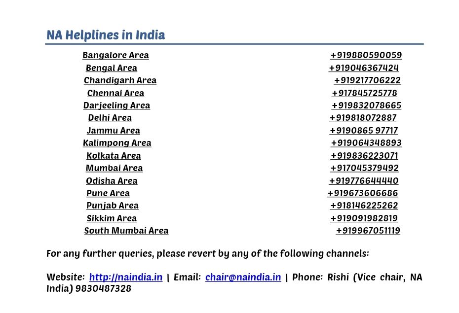 This is to introduce you to the 12-Step Program of Narcotics Anonymous (NA), as well as its existence and presence in the different states & cities in India. The Narcotics Anonymous message is that an addict, any addict, can stop using drugs, lose the desire to use and find a new way to live. Our intent is to share this message broadly so that those who might benefit from our program of recovery can find us.