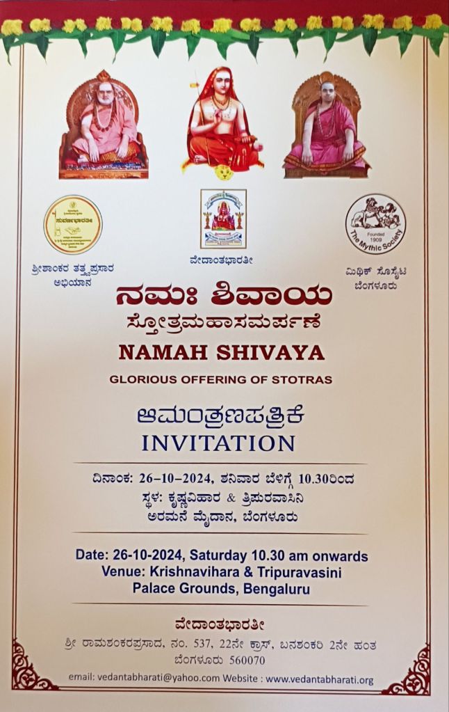 Vedanta Bharathi, Shankara Tattava Prasara Abhiyana in Association with The Mythic Society is Organizing a Mass Chanting Stotras “Namah Sshivaya” as a part of the Suvarna Bharathi Programme a yearlong celebration to commemorate the Golden Jubilee of Sanyasa of Jagadguru Sri Sri Bharathitheertha Swamiji the Pontiff of Sringeri Sharadapeeth, Sringeri.