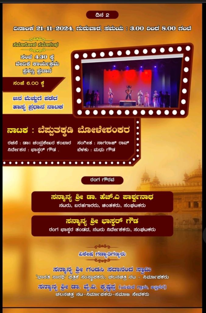 ಗುರುವಾರ ಸಂಜೆ ಸಮಾರೋಪ ಸಮಾರಂಭ ಸಂಜೆ 6 ಕ್ಕೆ “ಬೆಪ್ಪು ತಕ್ಕಡಿ ಬೋಳೇಶಂಕರ “ನಾಟಕ