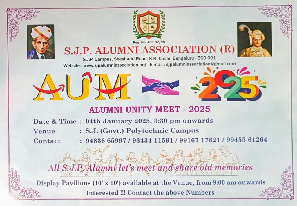 Bengaluru, January 2025: The S.J.P. Alumni Association (R), the Government-registered Techno-Socio-Economic Alumni Association of Sri Jayachamarajendra Polytechnic, invites alumni and media to mark their calendars for the highly anticipated Annual Unity Meet (AUM) 2025. The event will be held on Saturday, 4th January 2026, starting at 3:30 PM at the SJP Campus, Sheshadri Road, K.R. Circle, Bengaluru.