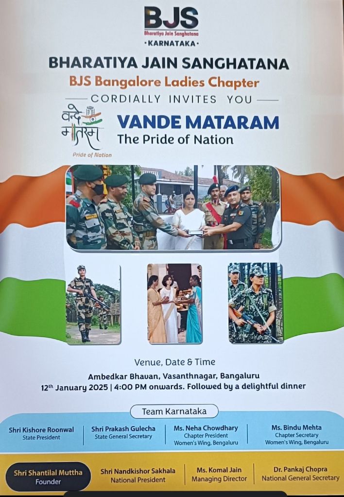 हम 12 जनवरी 2025 की शाम 5 बजे से अपना पहला कार्यक्रम आयोजित करेंगे, जिसके बाद बीआर अंबेडकर भवन बेंगलुरु में रात्रिभोज होगा। यह कार्यक्रम बीएसएफ (सीमा सुरक्षा बल) कर्मियों और सेना के कर्मियों के बलिदान को याद करने के लिए आयोजित किया जाएगा, जिन्होंने राष्ट्र की रक्षा के लिए अपना जीवन लगा दिया है। हम बीएसएफ और सेना के 9 शहीद परिवारों को नकद और सामान के साथ सम्मानित करेंगे ताकि उन्हें सर्वोत्तम संभव तरीके से समर्थन दिया जा सके, इसके बाद 100 से अधिक बीएसएफ अधिकारियों के साथ एक सांस्कृतिक देशभक्ति संगीत कार्यक्रम होगा। हमारे पास 1000 से अधिक लोग अतिथि के रूप में होंगे और कार्यक्रम रात 10 बजे समाप्त होगा। इस पवित्र और महान उद्देश्य के साथ, हम इस कार्यक्रम में आपकी उपस्थिति चाहते हैं और उद्देश्य का सम्मान करना चाहते हैं।