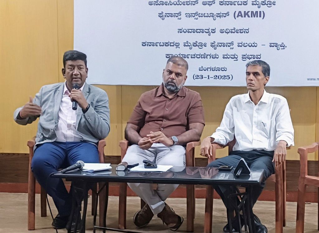 Bengaluru, 23 January 2025: Microfinance Industry Network (MFIN), a Self-Regulatory Organisation (BROJ recognised by Ral and the Association of Karnataka Microfinance Institutions (AKMI), jointly organised a press meet in Bengaluru to highlight the critical role of microlinance Institutions in improving the lives of the underprivileged sections of the sociely in the state. M Rama Kamaraju Head-State Initiatives of MAN along with Mr. Verikatesh N. Managing Director, IIFL. Samasta and Mr. Anand Rao. JMD. Chaltanya India Fin Credil underlined the Immense contribution of microcredit loans in fostering financial inclusivily and empowerment in both fural and urban Kamalaka
