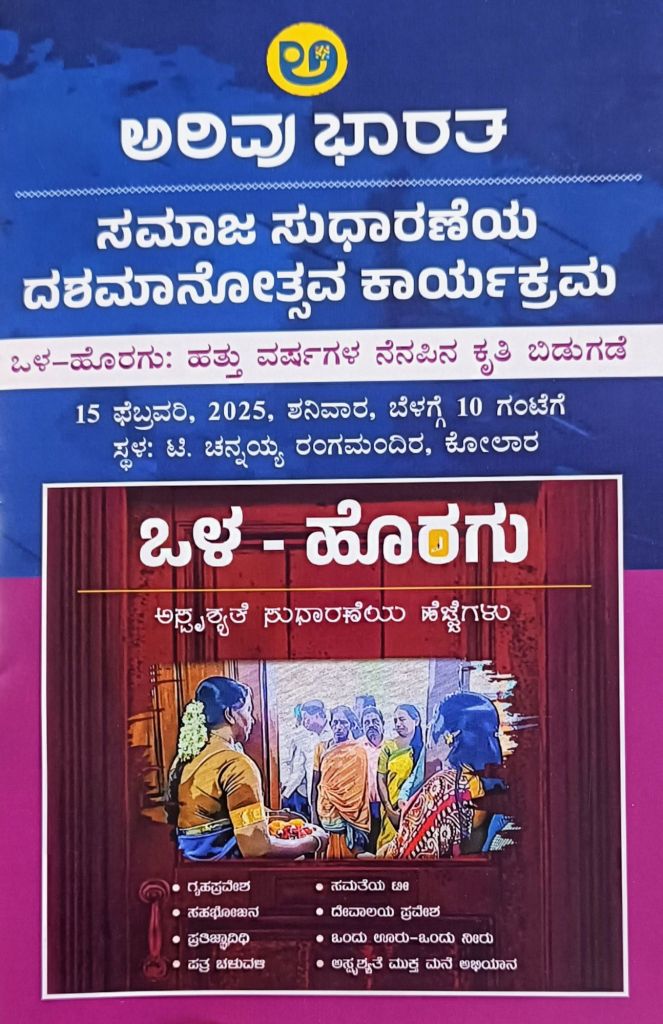 ಬೆಂಗಳೂರು , ಫೆಬ್ರವರಿ 12: ದಲಿತರಿಗೆ ಗೃಹಪ್ರವೇಶ, ದೇವಾಲಯ ಪ್ರವೇಶ ಹಾಗೂ ಅಸ್ಪೃಶ್ಯತೆ ಮುಕ್ತ ಸಮಾಜ ನಿರ್ಮಾಣದ ಸಂಕಲ್ಪದೊಂದಿಗೆ ಕಾರ್ಯನಿರ್ವಹಿಸುತ್ತಿರುವ ಅರಿವು ಭಾರತ ಸಂಸ್ಥೆಯು ದಶಮಾನೋತ್ಸವಕ್ಕೆ ಕಾಲಿಟ್ಟಿದ್ದು, ಫೆಬ್ರವರಿ 15ರಂದು ಕೋಲಾರದ ಟಿ. ಚನ್ನಯ್ಯ ರಂಗ ಮಂದಿರದಲ್ಲಿ ಅದ್ದೂರಿಯಾಗಿ ಕಾರ್ಯಕ್ರಮ ಆಯೋಜಿಸಿದೆ.