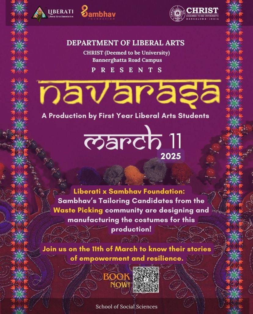 ಬೆಂಗಳೂರು, ಮಾರ್ಚ್ 6, 2025 – ಬೆಂಗಳೂರಿನ ಅನೌಪಚಾರಿಕ ತ್ಯಾಜ್ಯ ಆಯುವವರ ಜೊತೆಗಿನ ಏಕತೆಯ ಪ್ರಬಲ ಪ್ರದರ್ಶನದಲ್ಲಿ, ನಮ್ಮ ನಗರದ ಎಲೆಮರೆ ಕಾಯಿಗಳಾದ ಪರಿಸರ ಸಂರಕ್ಷಣಾ ಚಾಂಪಿಯನ್ಗಳು, ಸಂಭವ್ ಫೌಂಡೇಶನ್, ಕ್ರೈಸ್ಟ್ ಯೂನಿವರ್ಸಿಟಿ ಬನ್ನೇರುಘಟ್ಟ ರಸ್ತೆಯ ಲಿಬರಲ್ ಆರ್ಟ್ ವಿಭಾಗದ ಸಹಯೋಗದೊಂದಿಗೆ, ಮಾರ್ಚ್ 11, 2025 ರಂದು ಮನಮೋಹಕವಾದ ಥಿಯೇಟರ್ ನಿರ್ಮಾಣ-ನವರಸ ಮೂಲಕ ತಮ್ಮ ಕಥೆಗಳನ್ನು ಮುಖ್ಯವಾಹಿನಿಗೆ ತರುತ್ತಿದೆ.