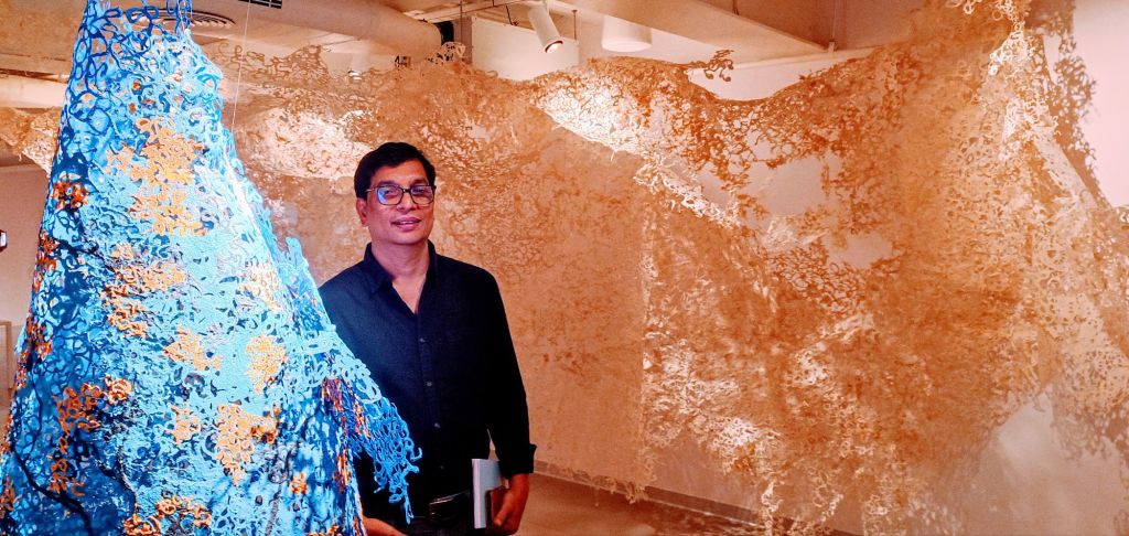 Kashi, known for his experimental approach to materials, engages deeply with the Kannada script, not merely as a means of communication but as a symbolic representation of relationships and cultural permeability. Through intricate sculptural forms and textural compositions, he reimagines letters from the Kannada alphabet, turning them into metaphors that challenge conventional notions of language and boundaries.