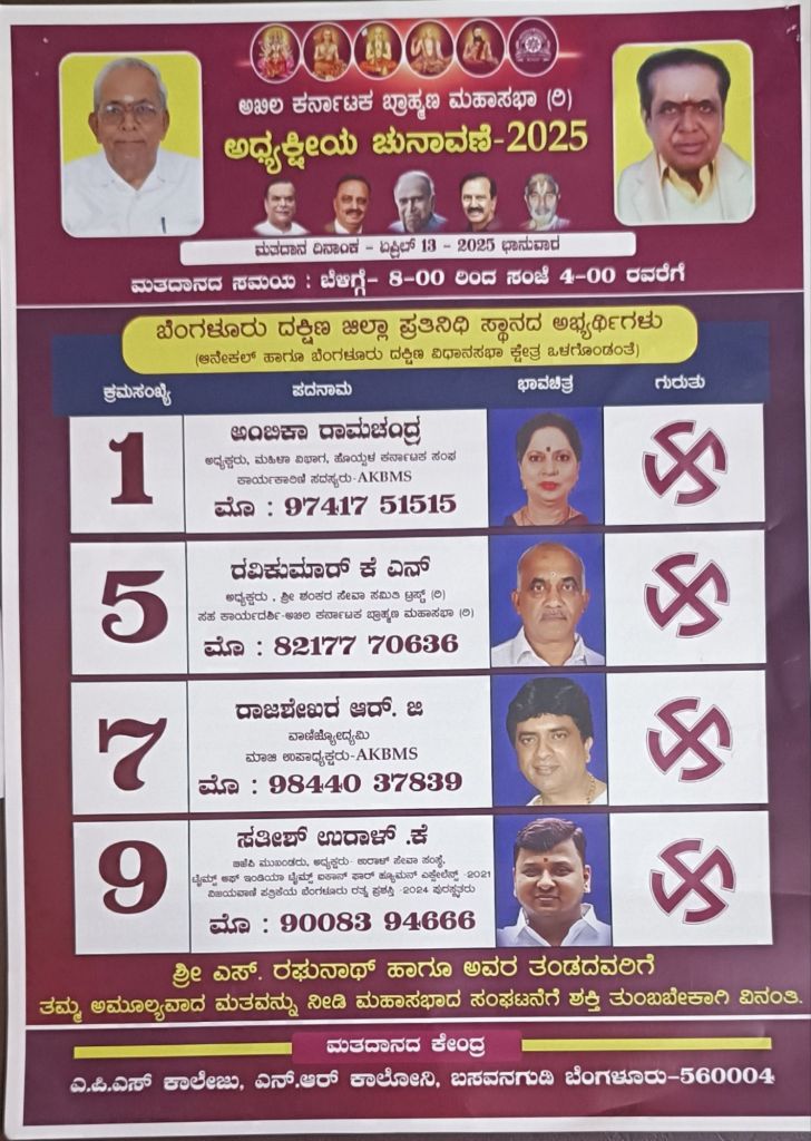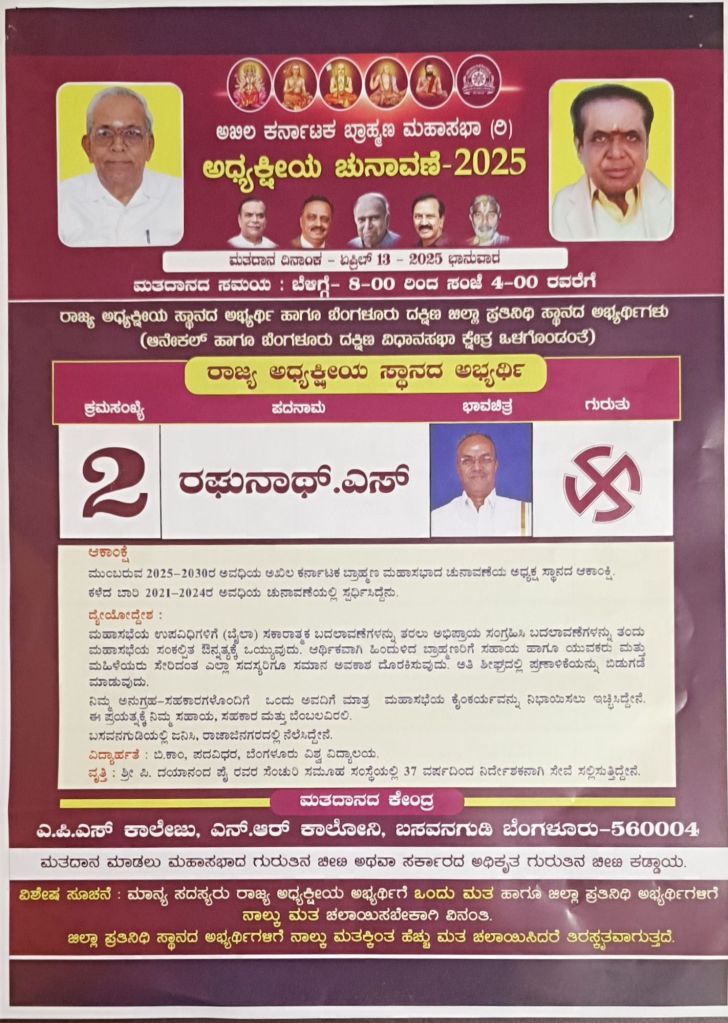 ಅಖಿಲ ಕರ್ನಾಟಕ ಬ್ರಾಹ್ಮಣ ಮಹಾಸಭಾ (ರಿ) ಅಧ್ಯಕ್ಷ ಸ್ಥಾನಕ್ಕೆ ರಘುನಾಥ್ ಎಸ್. ಅಭ್ಯರ್ಥಿ ಘೋಷಣೆ – 2025–2030 ಅವಧಿಗೆ ಪ್ರಣಾಳಿಕೆ ಬಿಡುಗಡೆ