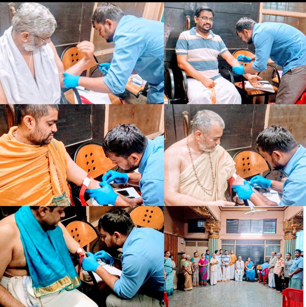 The health camp was conducted by the team from QXL Diagnostic Center, led by Shri Abhijith, and was intended for the benefit of the Math’s staff and their family members. Shri Nandakishore Acharya from the Math shared details about the camp.