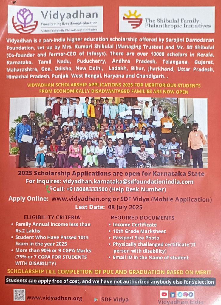 For further details, students may contact vidyadhan.karnataka@sdfoundationindia.com or reach out to the Vidyadhan Helpdesk at +91 8068333500.