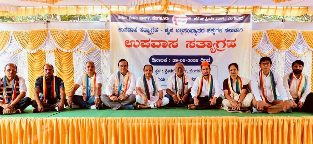 बेंगलुरु, 29 मई — जैन समुदाय के सदस्यों ने जैन डेवलपमेंट फोरम के बैनर तले बुधवार को बेंगलुरु के फ्रीडम पार्क में एक शांतिपूर्ण उपवास सत्याग्रह की शुरुआत की। इस आंदोलन का उद्देश्य कर्नाटक सरकार से लंबे समय से लंबित मांगों को पूरा करवाना है।