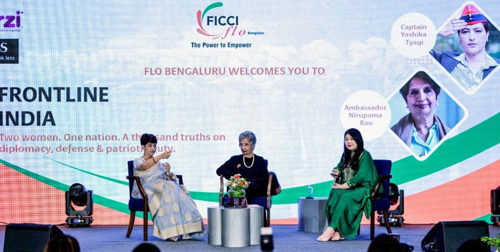 बेंगलुरु, 9 जून 2025 — फेडरेशन ऑफ इंडियन चैंबर्स ऑफ कॉमर्स एंड इंडस्ट्री (FICCI) की महिला विंग फिक्की फ्लो, बेंगलुरु चैप्टर ने एक प्रेरणादायक नेतृत्व संवाद कार्यक्रम ‘फ्रंटलाइन इंडिया’ का आयोजन किया। इस अवसर पर भारत की दो अग्रणी महिला आइकन — पूर्व विदेश सचिव एवं राजनयिक निरुपमा राव और सेना की पूर्व अधिकारी एवं मोटिवेशनल स्पीकर कैप्टन यशिका हटवाल त्यागी ने अपने अनुभव साझा किए।