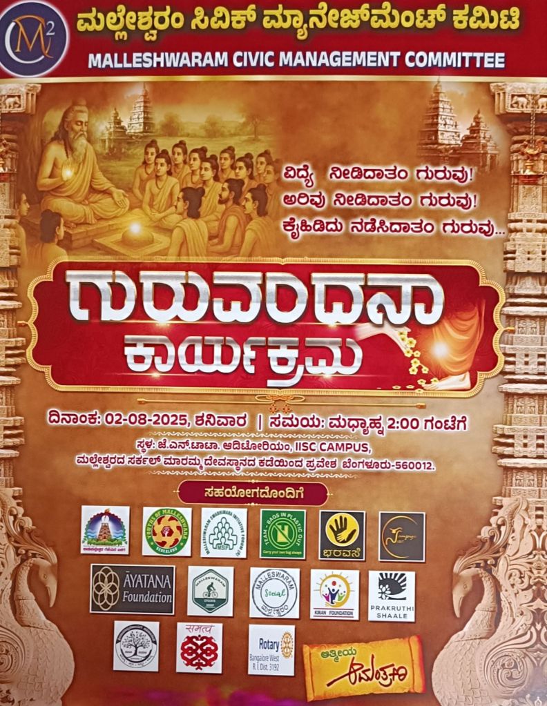 The Malleswaram Civic Management Committee will host Guruvandana, a special felicitation program to honour educators and distinguished individuals across various fields, on Saturday, August 2, at 2:00 PM, at the J.N. Tata Auditorium, Indian Institute of Science (IISc) Campus, Malleswaram, Bengaluru.