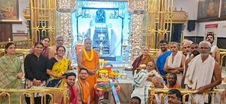 Arriving from the sacred Shri Ranganatha temple in Srirangam, Tamil Nadu, during his spiritual tour, the seer was warmly welcomed at the math by the administrator, R.K. Vadhindracharya, who offered a floral reception.