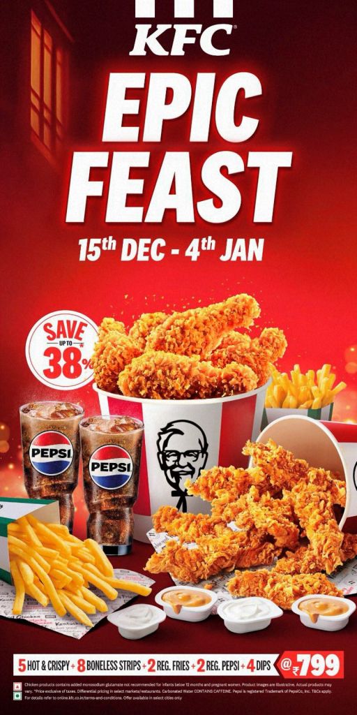 ಕೇವಲ ₹799 ರಿಂದ ಆರಂಭವಾಗುವ ಈ ವಿಶೇಷ ಆಫರ್ ಇದೀಗ ಆಂಧ್ರಪ್ರದೇಶ ಮತ್ತು ತೆಲಂಗಾಣ, ಪಶ್ಚಿಮ ಬಂಗಾಳ, ರಾಜಸ್ಥಾನ, ಕರ್ನಾಟಕ ಸೇರಿದಂತೆ ದೇಶದ ಹಲವು ಭಾಗಗಳಲ್ಲಿ ಲಭ್ಯವಿದೆ. ಗ್ರಾಹಕರು ಡೈನ್-ಇನ್ ಹಾಗೂ ಟೇಕ್ಔಟ್ ಎರಡೂ ಆಯ್ಕೆಗಳ ಮೂಲಕ ಈ ಆಫರ್ ಅನ್ನು ಪಡೆಯಬಹುದಾಗಿದೆ. ಈ ಎಪಿಕ್ ಫೀಸ್ಟ್ ಆಫರ್ ಜನವರಿ 4, 2026ರವರೆಗೆ ಮಾತ್ರ ಲಭ್ಯವಿರಲಿದೆ ಎಂದು KFC ತಿಳಿಸಿದೆ.