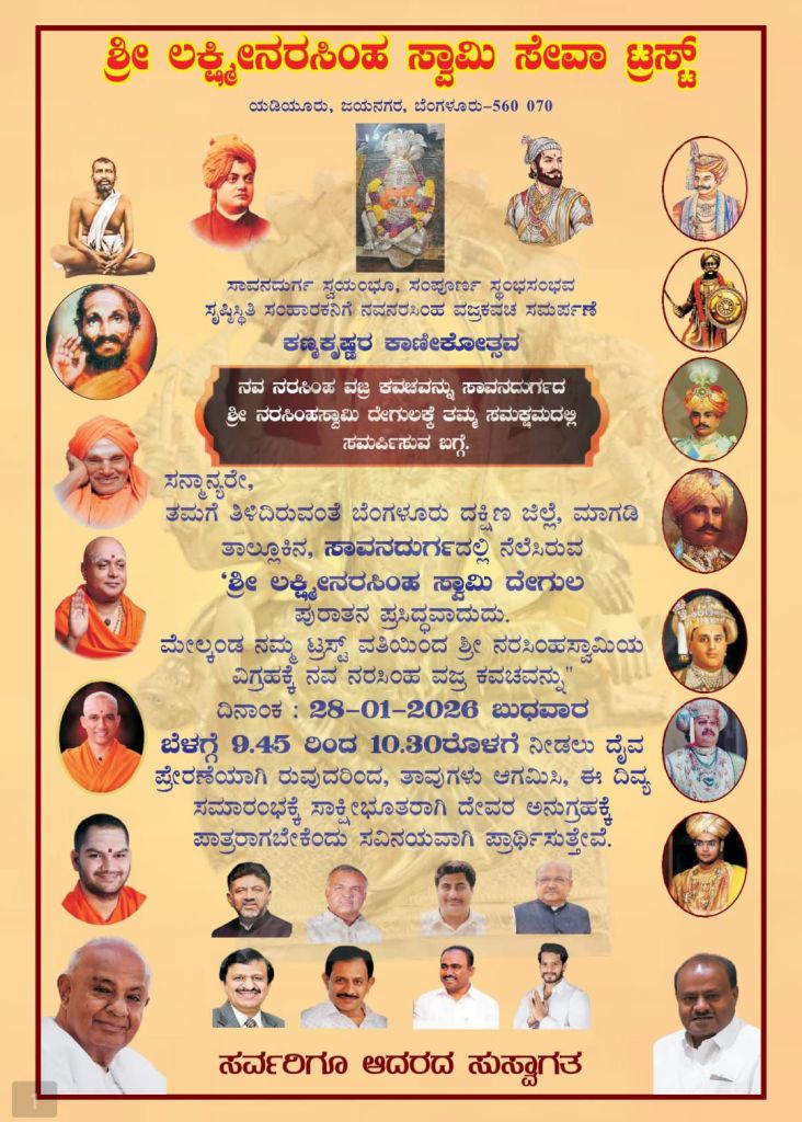 ಬೆಂಗಳೂರು ದಕ್ಷಿಣ ಜಿಲ್ಲೆ, ಮಾಗಡಿ ತಾಲ್ಲೂಕಿನ ಸಾವನದುರ್ಗದಲ್ಲಿ ಸ್ಥಿತವಾಗಿರುವ ಪುರಾತನ ಹಾಗೂ ಪ್ರಸಿದ್ಧ ಶ್ರೀ ಲಕ್ಷ್ಮೀನರಸಿಂಹ ಸ್ವಾಮಿ ದೇಗುಲದಲ್ಲಿ ಕಣ್ಮಕೃಷ್ಣರ ಕಾಣೀಕೋತ್ಸವದ ಅಂಗವಾಗಿ ಮಹತ್ವದ ಧಾರ್ಮಿಕ ಸಮಾರಂಭವನ್ನು ಆಯೋಜಿಸಲಾಗಿದೆ.