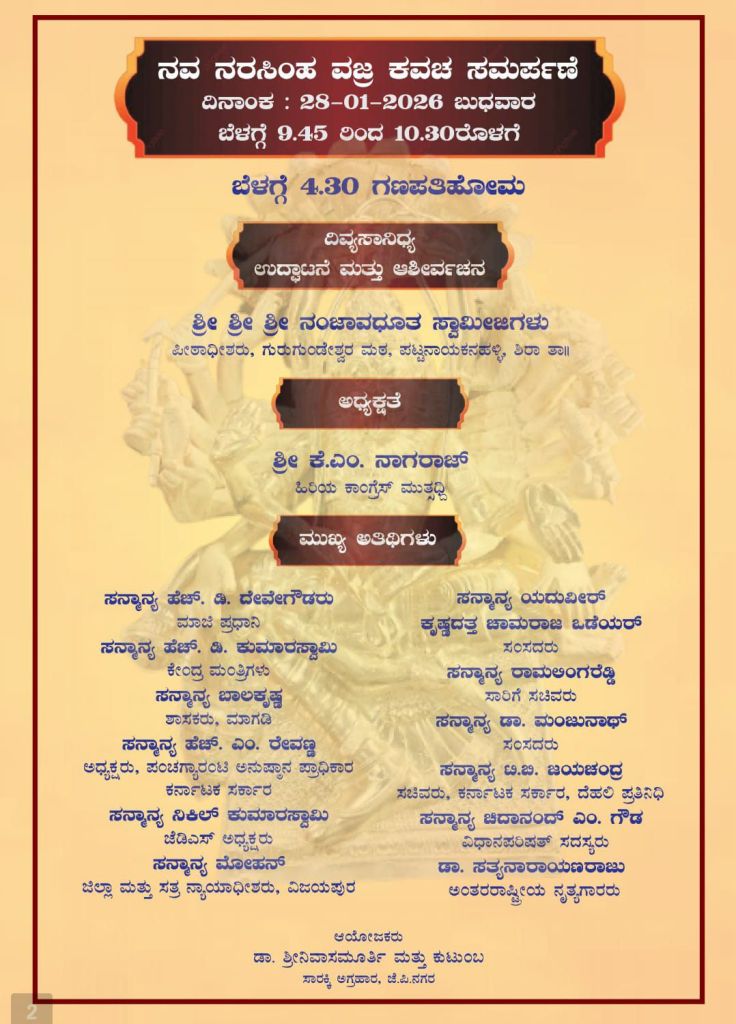 ಈ ಸಂದರ್ಭದಲ್ಲಿ ಟ್ರಸ್ಟ್ ವತಿಯಿಂದ ಶ್ರೀ ನರಸಿಂಹಸ್ವಾಮಿಯ ವಿಗ್ರಹಕ್ಕೆ ನವ ನರಸಿಂಹ ವಜ್ರ ಕವಚವನ್ನು ಸಮರ್ಪಿಸಲಾಗುತ್ತದೆ. ಈ ದಿವ್ಯ ಸಮರ್ಪಣಾ ಕಾರ್ಯಕ್ರಮವು ಜನವರಿ 28, 2026ರಂದು ಬೆಳಗ್ಗೆ 9.45 ರಿಂದ 10.30ರೊಳಗೆ ದೇವರ ಸನ್ನಿಧಿಯಲ್ಲಿ ನೆರವೇರಲಿದೆ.