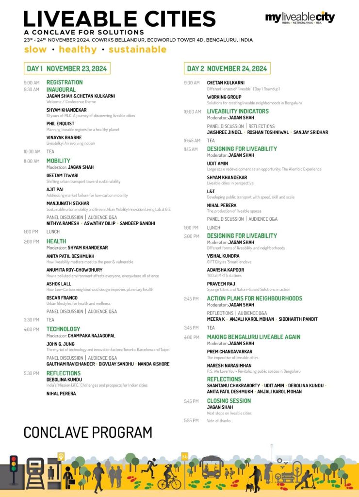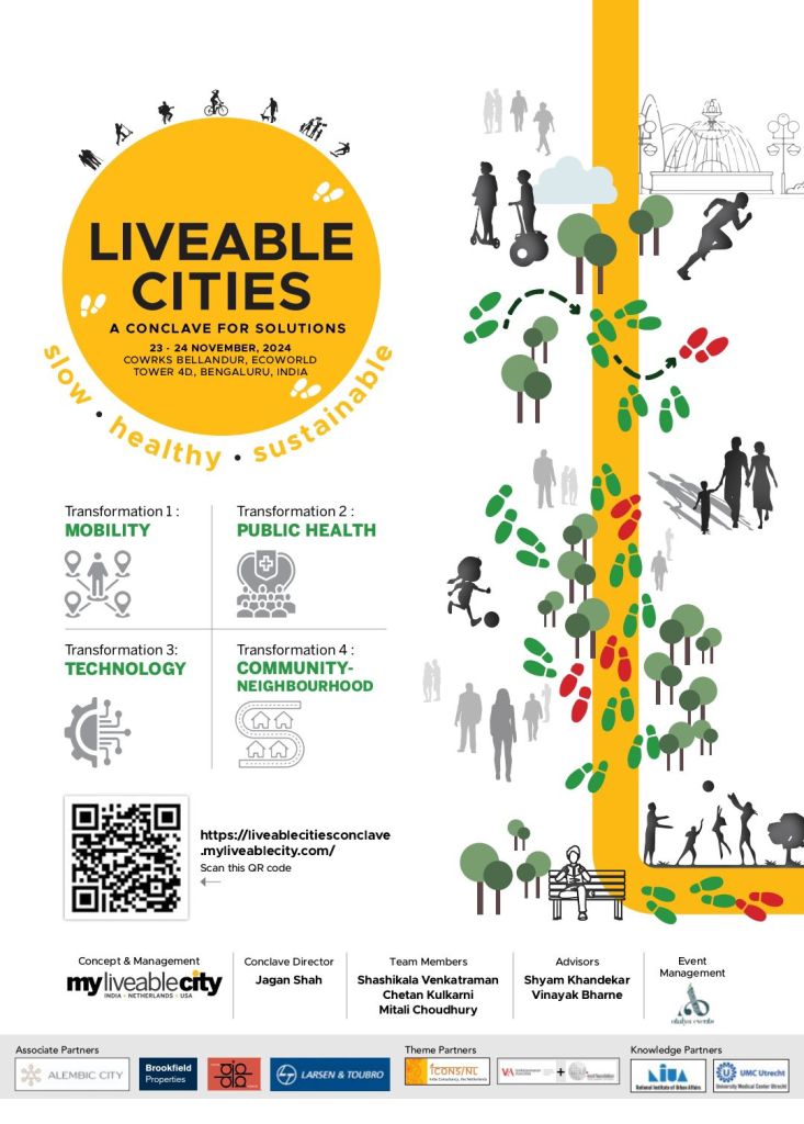 BENGALURU / November 20, 2024: A two-day Conclave “Liveable Cities – Slow, Healthy, Sustainable” is set to begin in Bengaluru on November 23, 2024. Numerous eminent speakers from India and abroad, including experts, visionaries, technologists, investors, technologists, property developers, and community leaders, will put forth their observations and share solutions from their real-world experience.