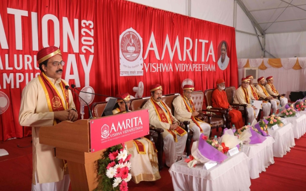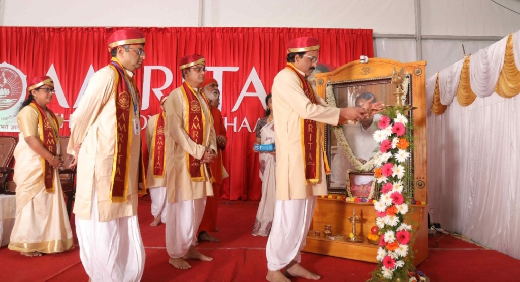 During a virtual address, Mata Amritanandanmayi Devi, Chancellor, Amrita Vishwa Vidyapeetham, said, “Remember the story of the lazy youth turned successful model. Patience and discernment transformed a liability into an asset. Experience is the true guru. Use knowledge gained from experience alongside theoretical knowledge. As you step into the job market, let patience and sraddha guide you. Life presents various situations. When choice is yours, don’t simply defer to fate. Exercise discrimination and take action. But when choice is absent, accept it as divine will. To bear fruit, actions require the right time, self-effort, and God’s grace. Seek the source of the power driving intellect—it resides within. The truth of existence is undeniable. Good deeds attract grace, making our actions complete and meaningful.”